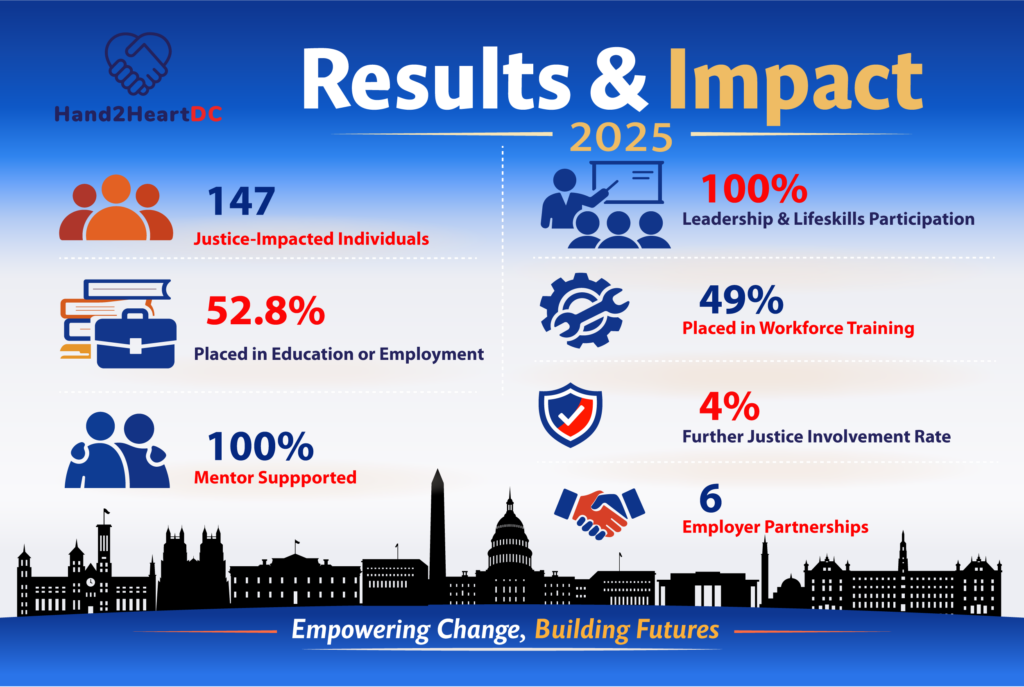 In 2025, Hand2Heart continued to expand its impact across the region, working with 147 justice-impacted individuals seeking to build stable, meaningful lives after incarceration. Through structured programming focused on leadership, life skills, mentorship, and workforce readiness, participants developed the tools needed to move forward with confidence and purpose. Every participant engaged in leadership and life-skills programming and received mentorship support, reinforcing Hand2Heart’s commitment to walking alongside individuals throughout the reentry process.